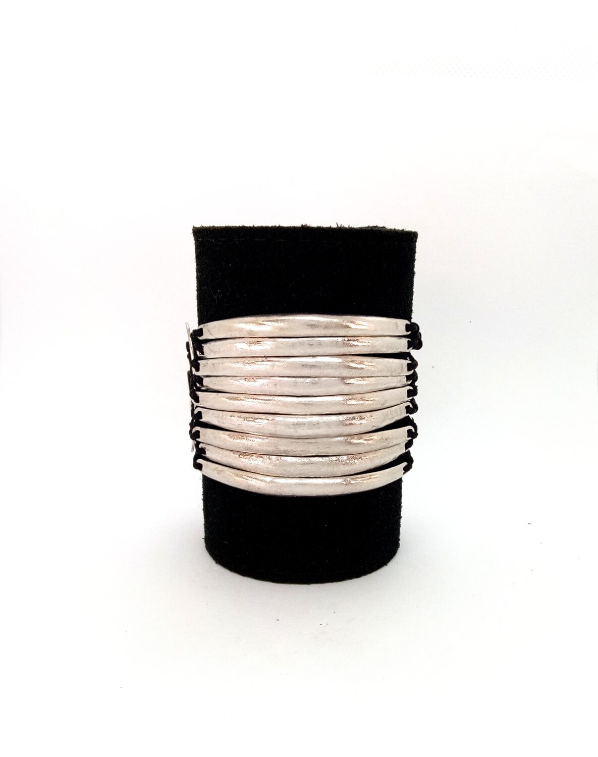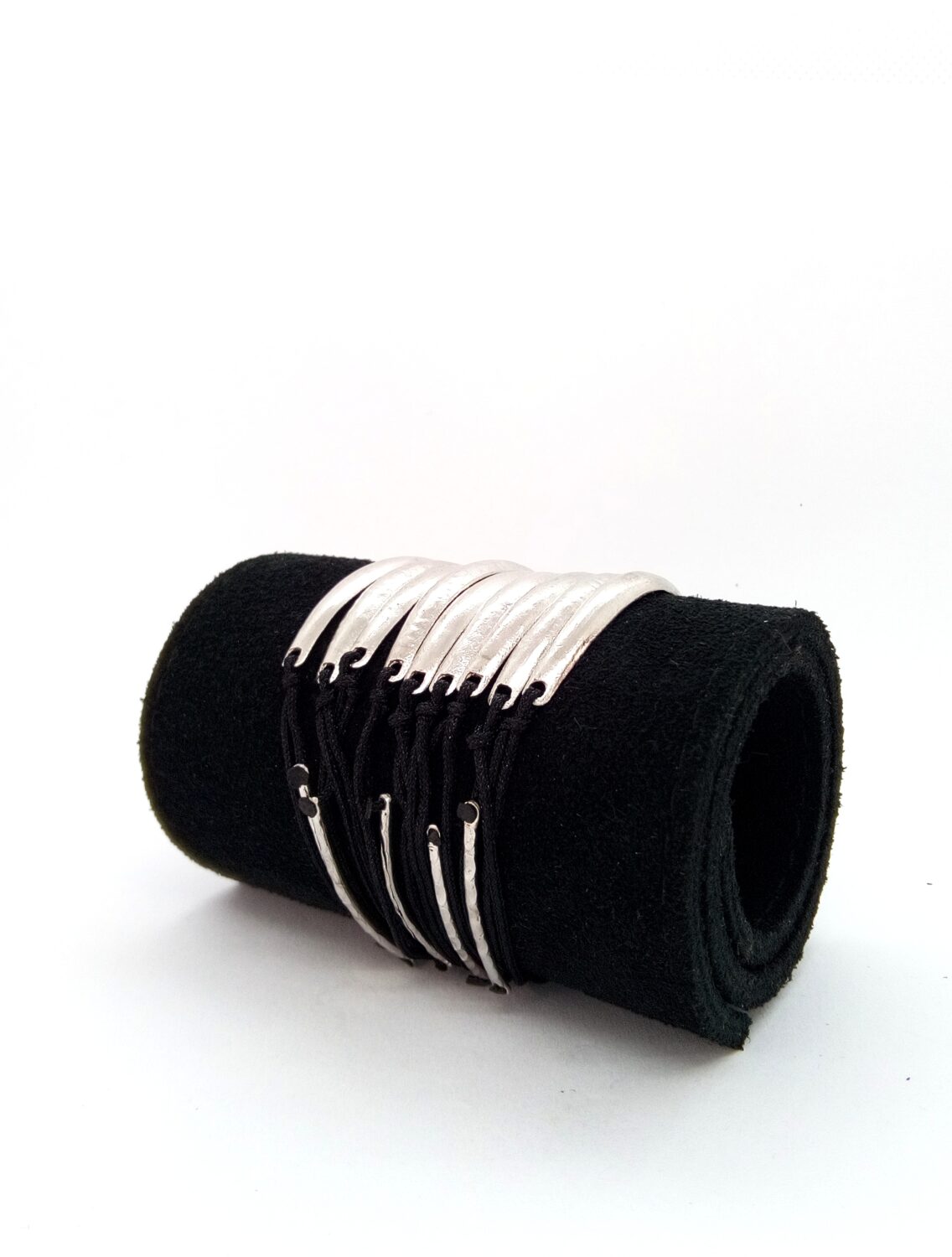 Silver bracelet with black laces and scratch finish in three color options. Silver, gold and black.