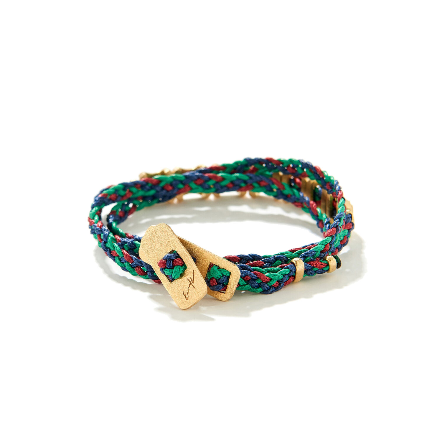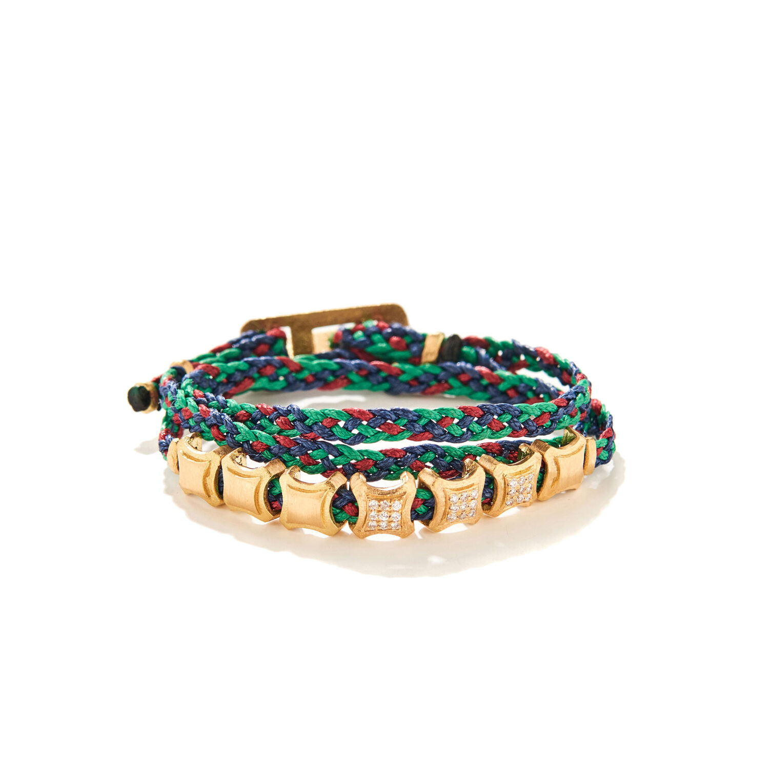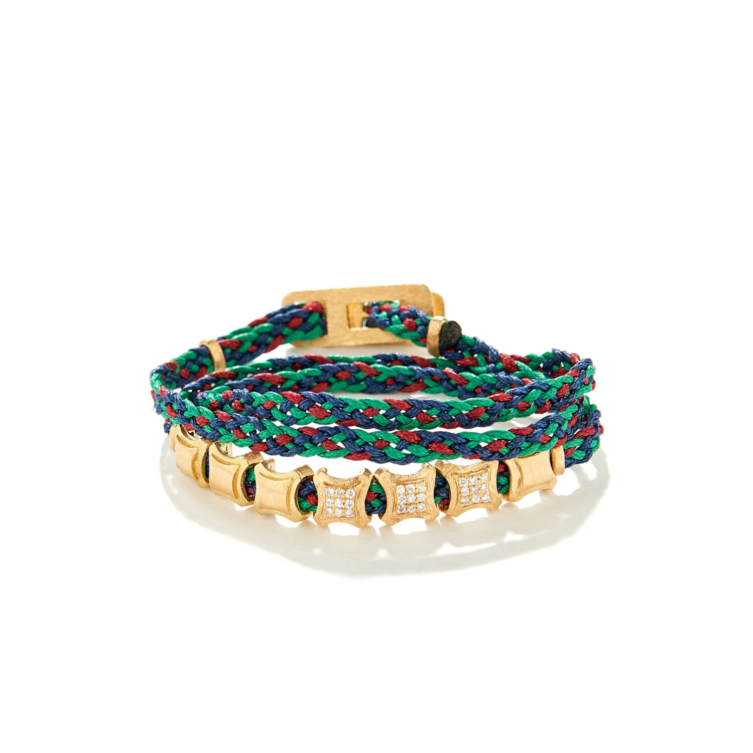 Unique gold square shape, with brilliant cut shiny diamonds in line with handmade multicolored cords that can easily accompany you most of the time. Easy to use clasp and adjust size.