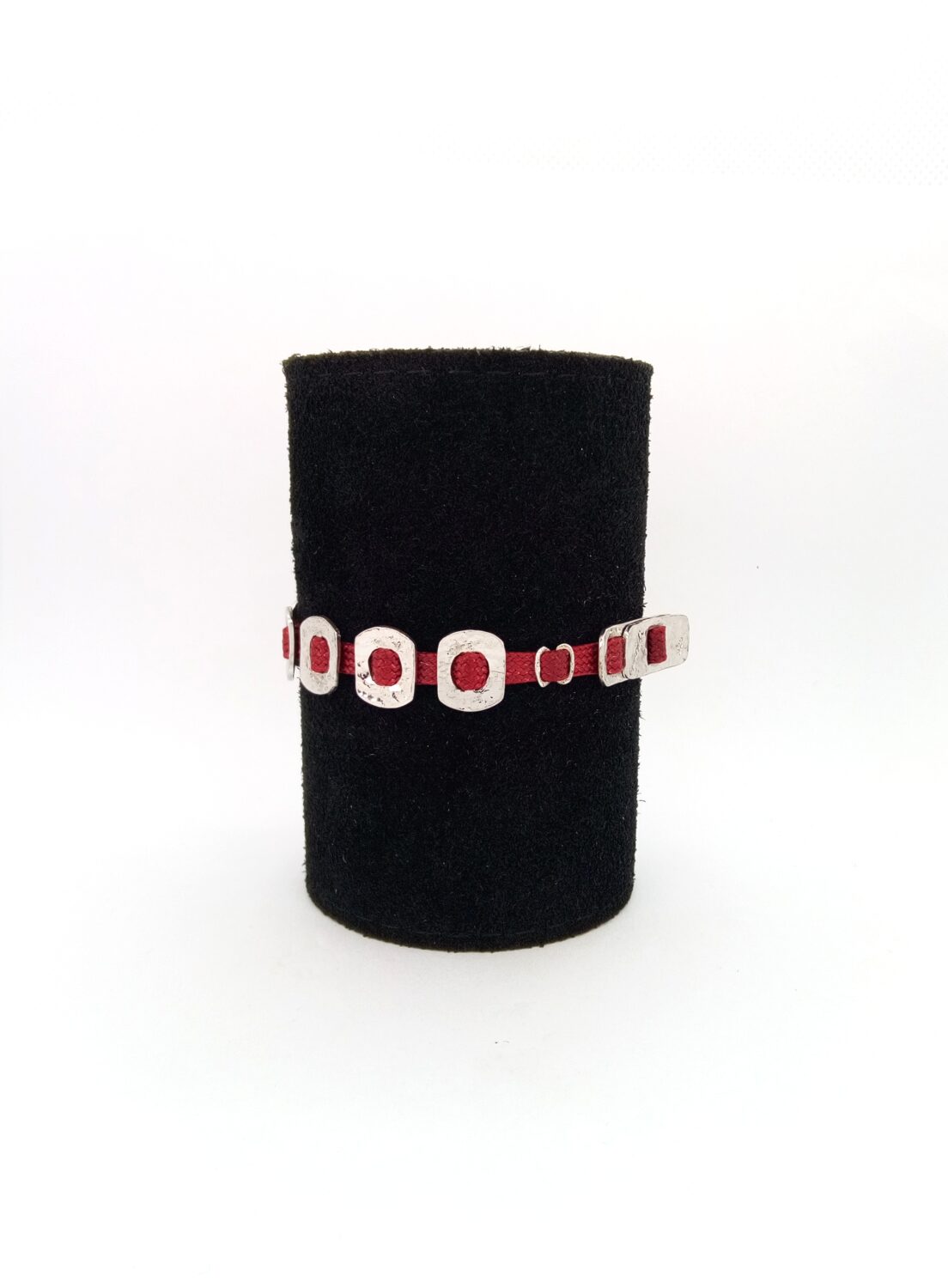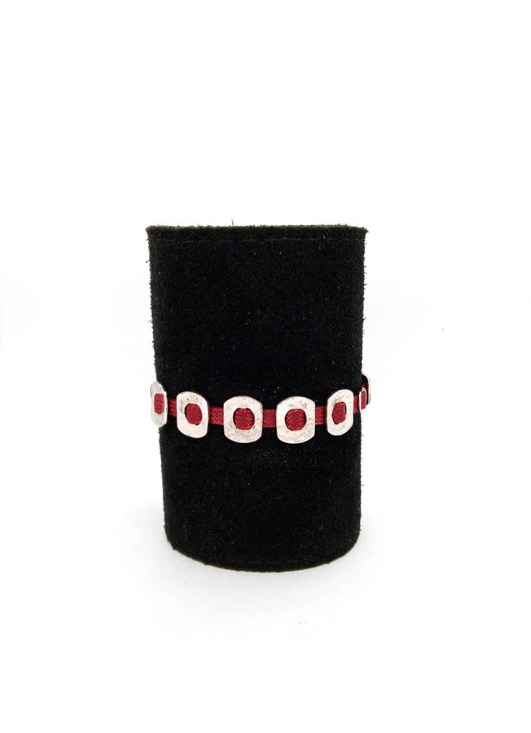 Ασημένιο βραχιόλι με κόκκινο κορδόνι και σφυρήλατο φινίρισμα σε τρεις επιλογές χρωμάτων ασημί, χρυσό και μαύρο.
