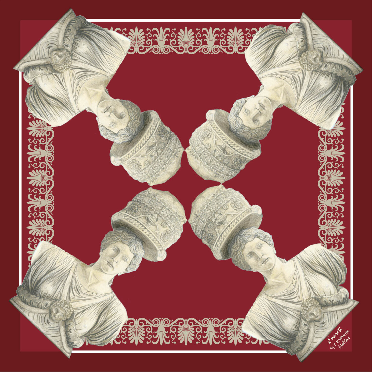 Μεταξωτό μαντήλι με την προτομή της δίδυμης Καρυάτιδας της Ελευσίνας. Σε κόκκινο και σε μπλέ οινοπνευματί.