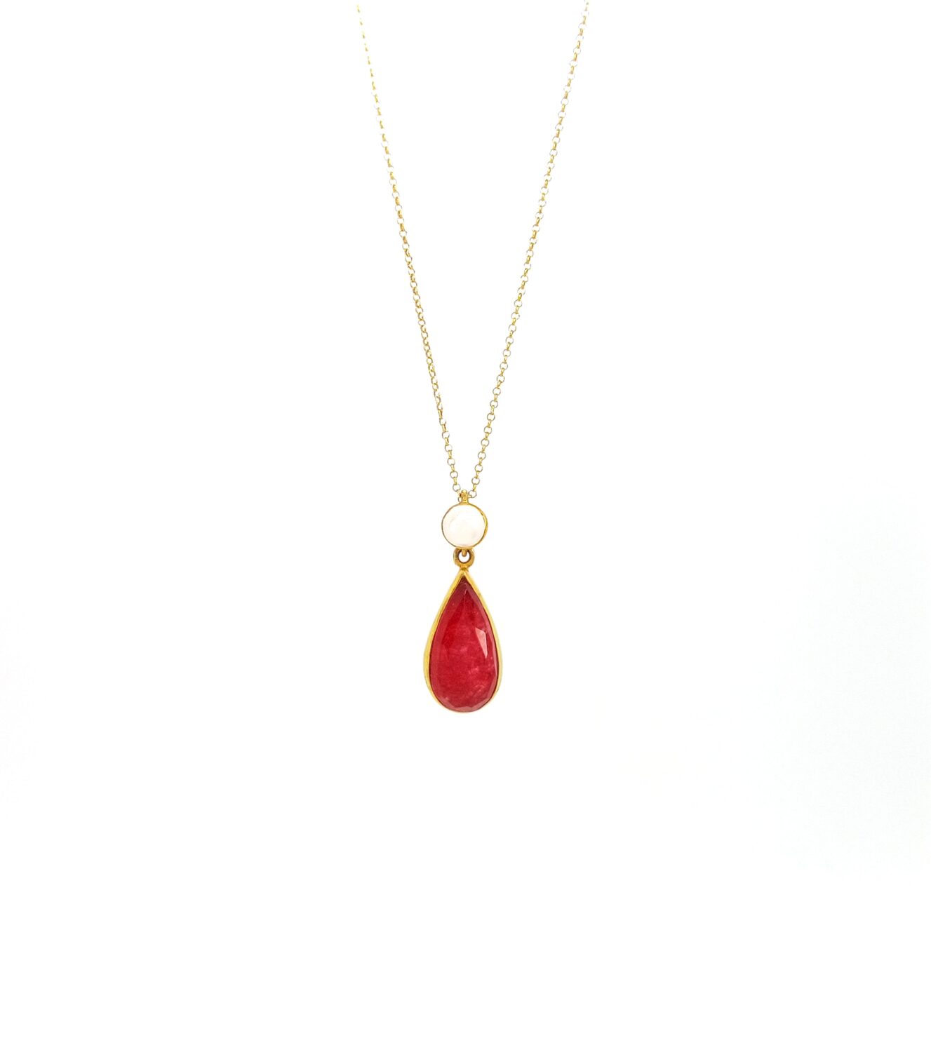 Silver necklace with rubelite and pearl in two color options silver and gold plated.